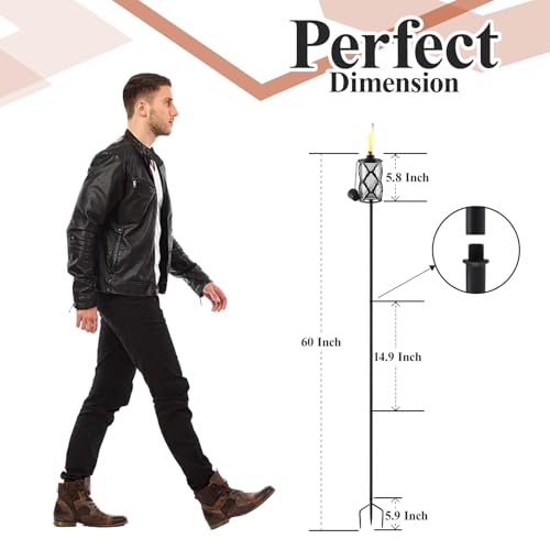 - Product Size: The size of the torch head is 3.5 inches wide x 3.5 inches deep x 5.5 inches tall. Each outside garden torches came with 3 stakes(14.3 Inch). You can assemble the garden torches to your desired height. They meet the needs of various usage scenarios, with a maximum height of 55 in and a minimum height of 14.5 in. Each torch holds approximately 16 oz of fuel, reducing the frequency of refills and allowing for long-lasting light and relaxing atmosphere