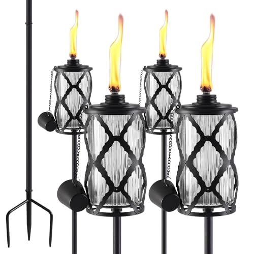 - Long-Lasting & Durable: Made with high-quality glass and long-lasting fiberglass wicks, these Glass Garden Torch are refillable and built to last. Glass Torch has 3-prong grounded stake, means the firmness and stability are much better than 1 prong, ensuring the metal torch lasts for several seasons. For each torch also includes a metal snuffer for safe extinguishing