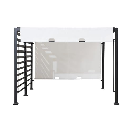 Enhance your backyard with the clean lines and purposeful design of the SUNJOY 10x12 Steel Pergola. Crafted to balance function and modern appeal, this pergola features a crisp white 450g/m² Textilene canopy that’s breathable, UV-blocking, and CPAI-84 fire-retardant certified—perfect for safe all-day enjoyment. - The canopy slides effortlessly along the frame using an easy-grip handle, giving you full control over sun and shade. - The powder-coated steel structure is built to last, offering outstanding weather resistance and long-term durability. - A sleek, integrated privacy wall provides visual protection from neighboring views, while anchoring plates and ground stakes offer a secure setup on soft surfaces. - Whether you're relaxing solo or hosting a gathering, this pergola transforms your outdoor space into a private oasis.